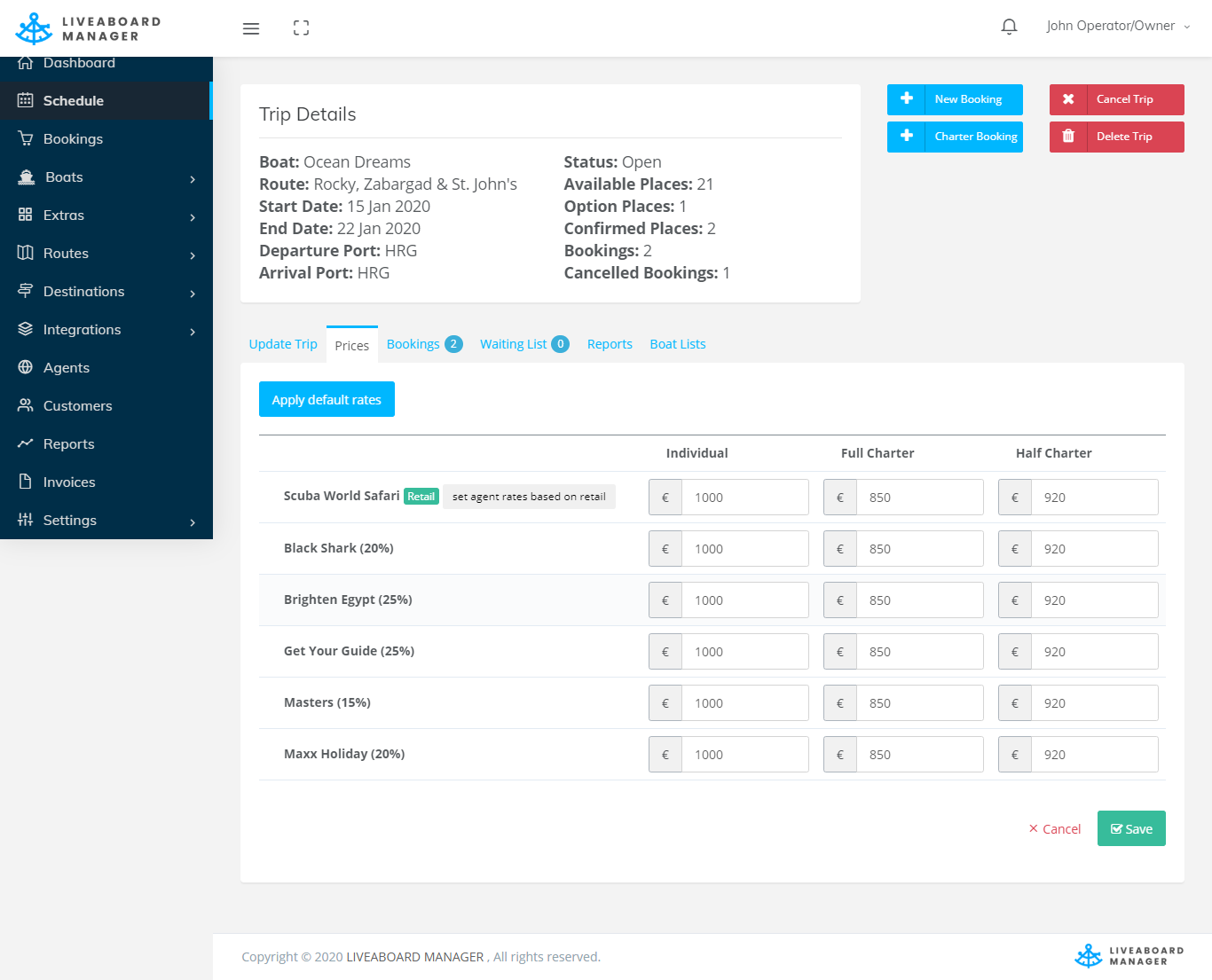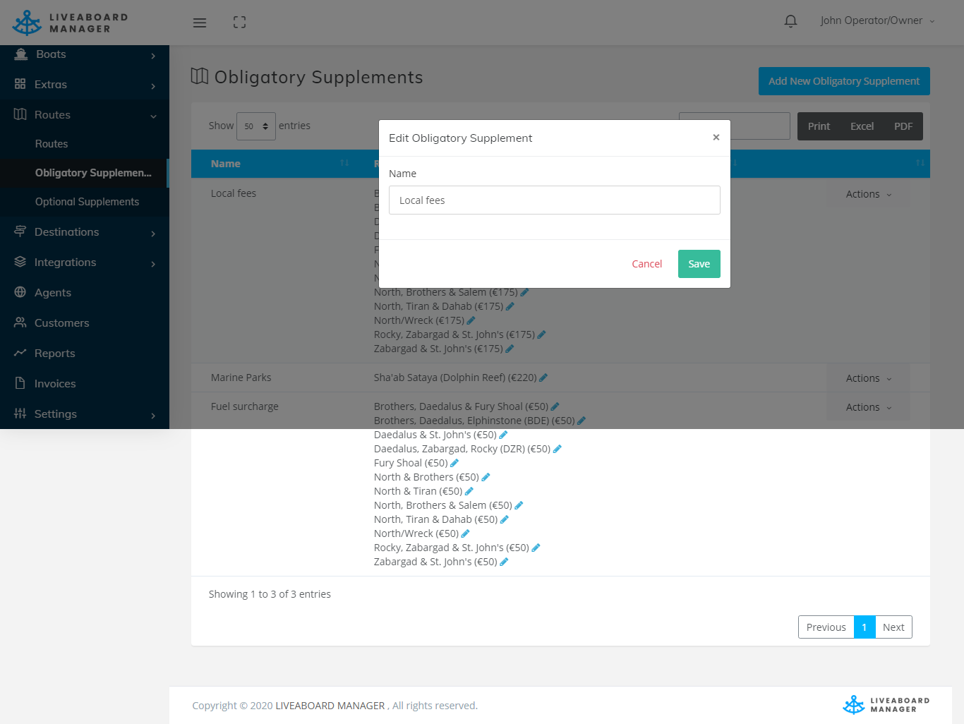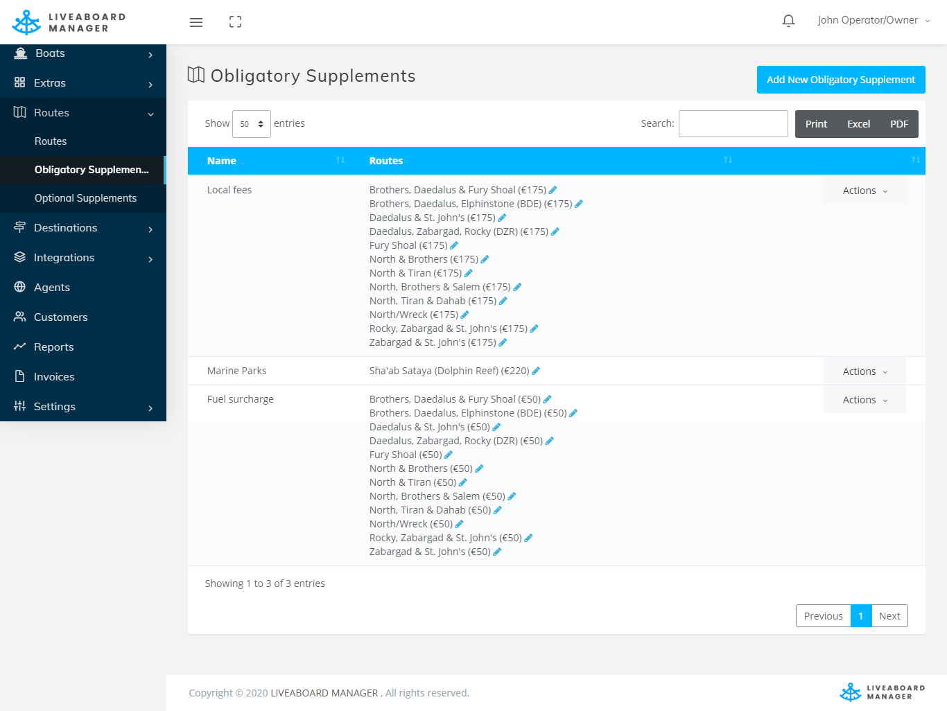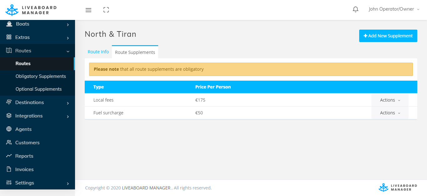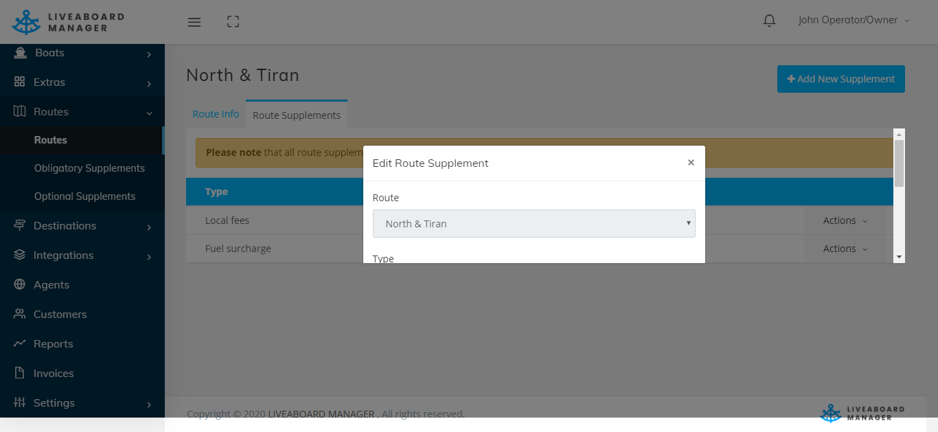 Add all the routes that your boats frequent. Add their details including supplements and other details that cascade into how bookings are calculated.